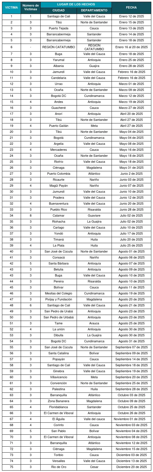 Conoce los datos de las masacres ocurridas en Colombia durante el 2025
