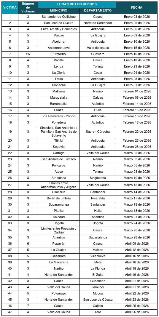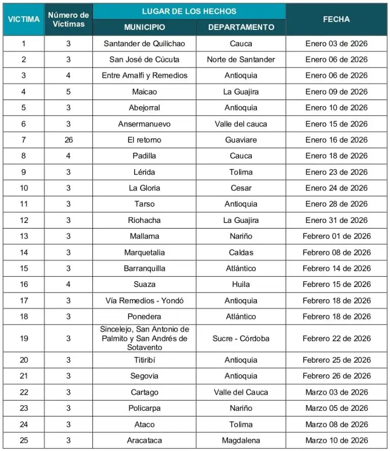 Conoce los datos de las masacres ocurridas en Colombia durante el 2026